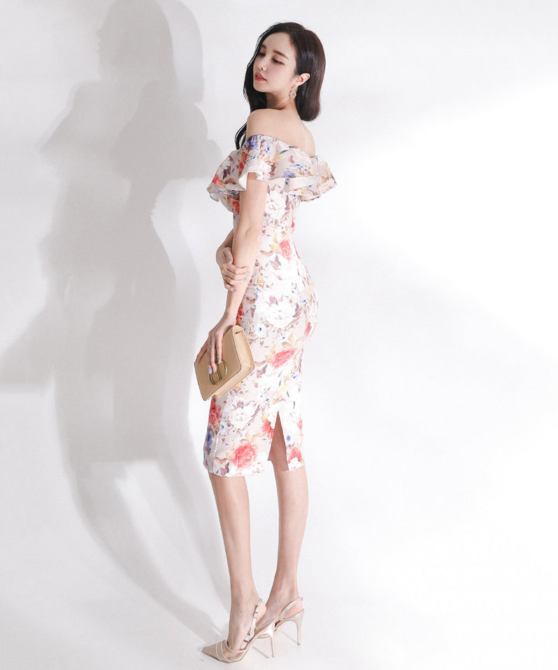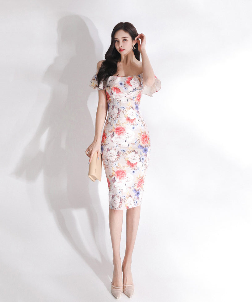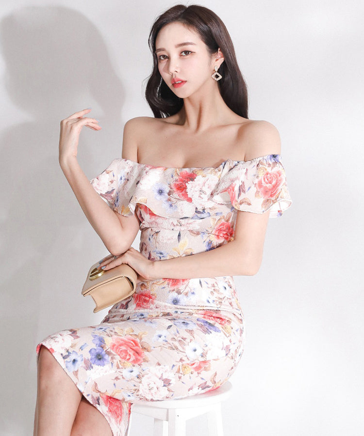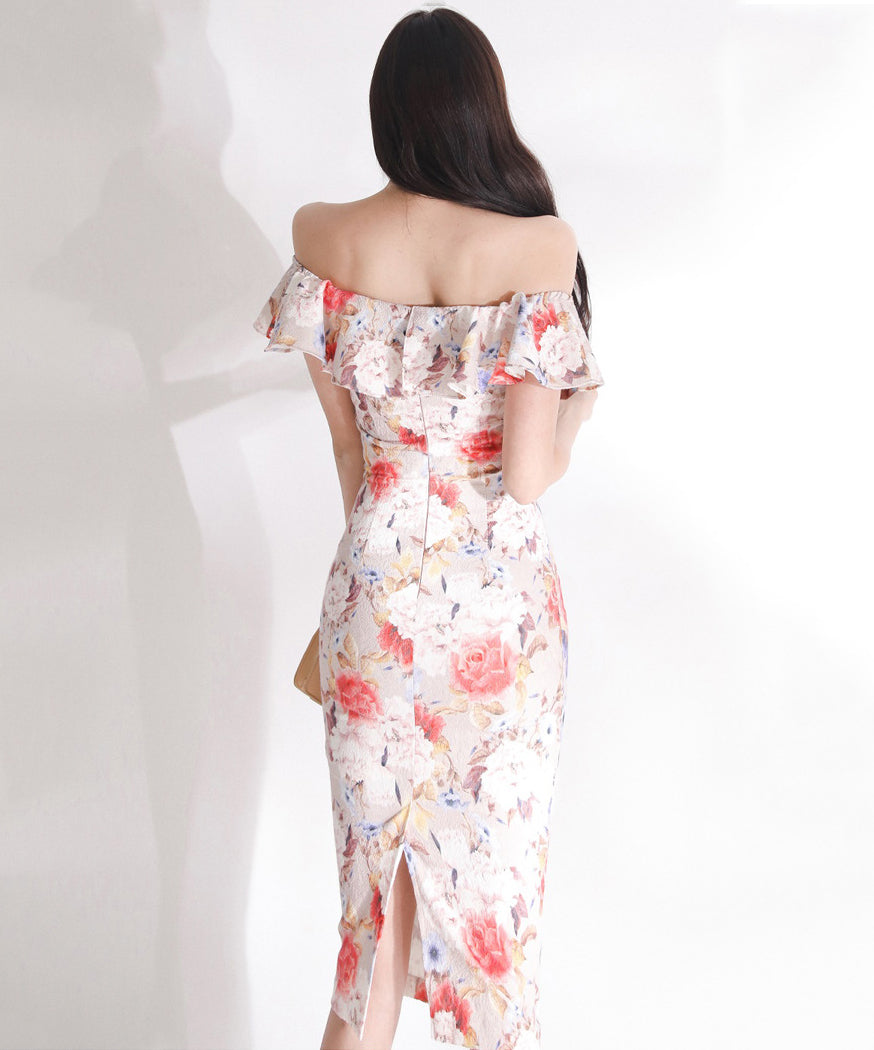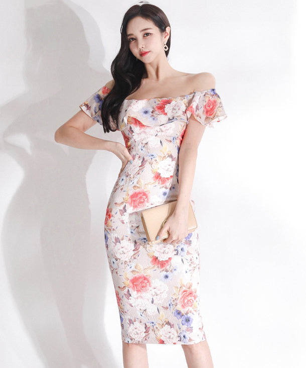 花柄 フリル ひらひら オフショルダー ゴージャス ひざ丈ドレス かわいい MY2-ZED880508E49