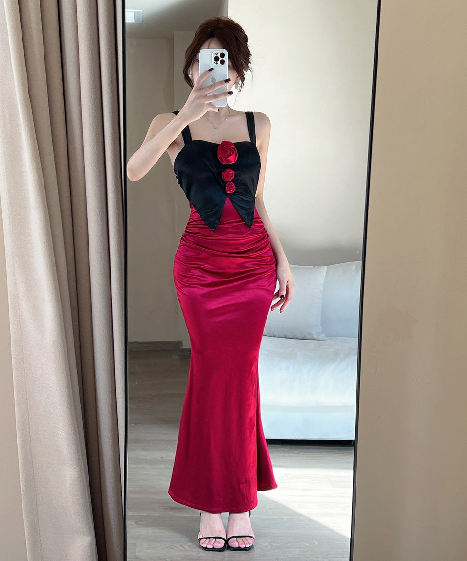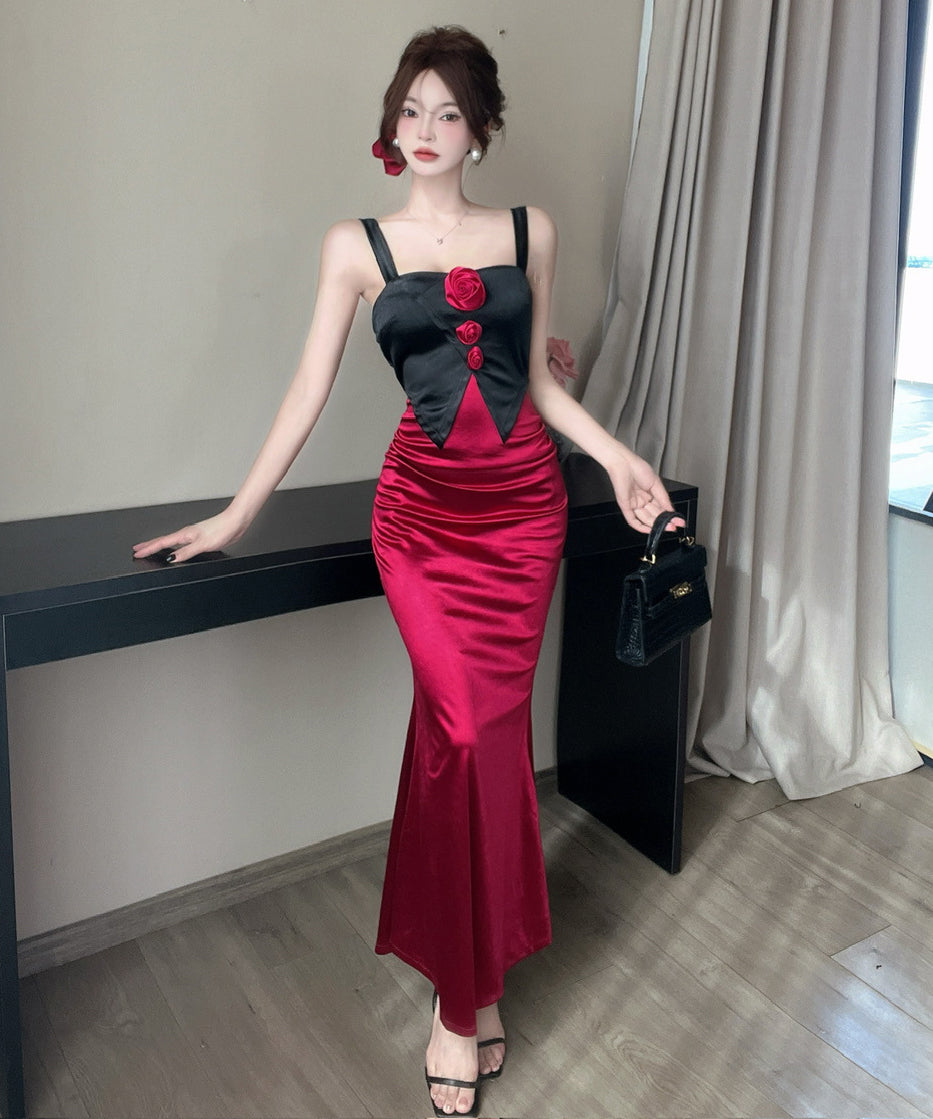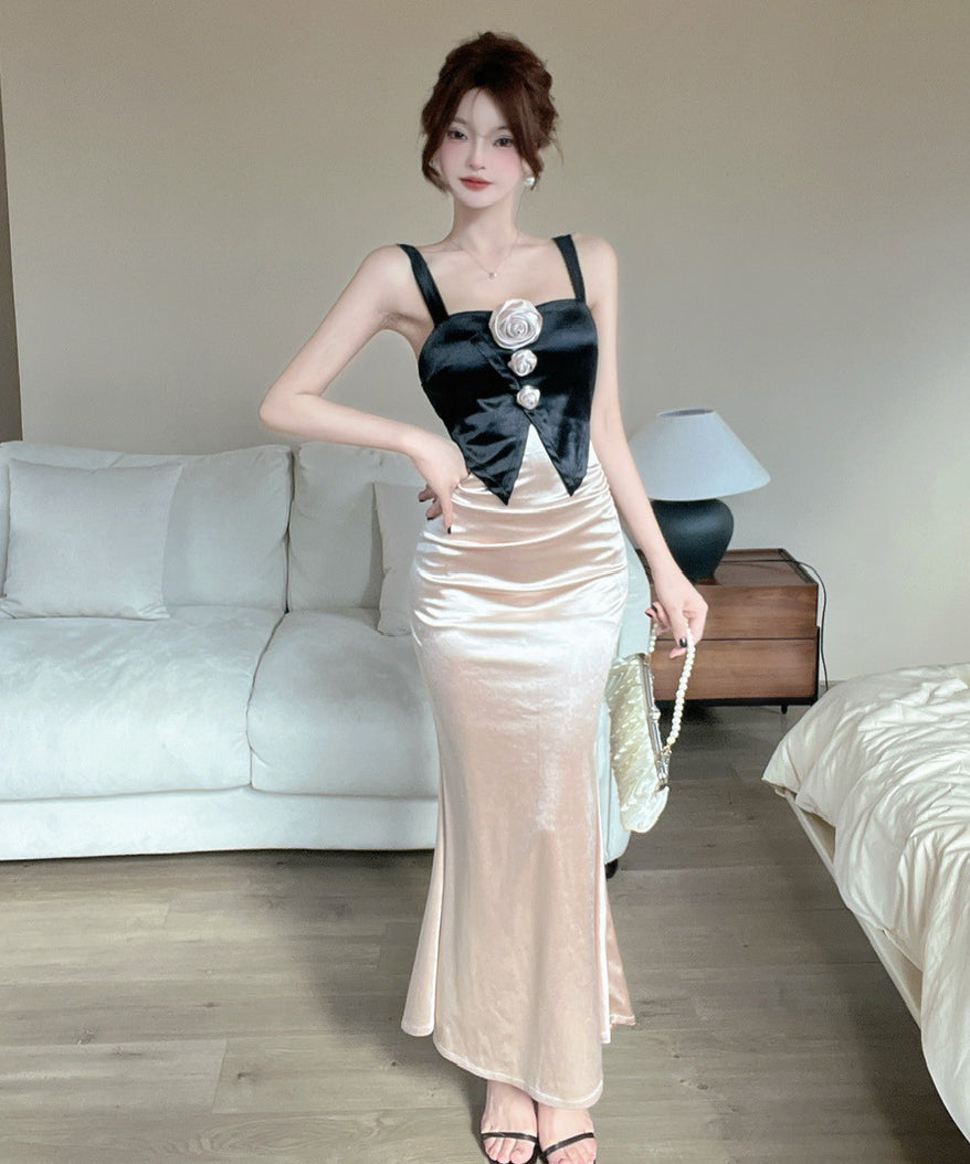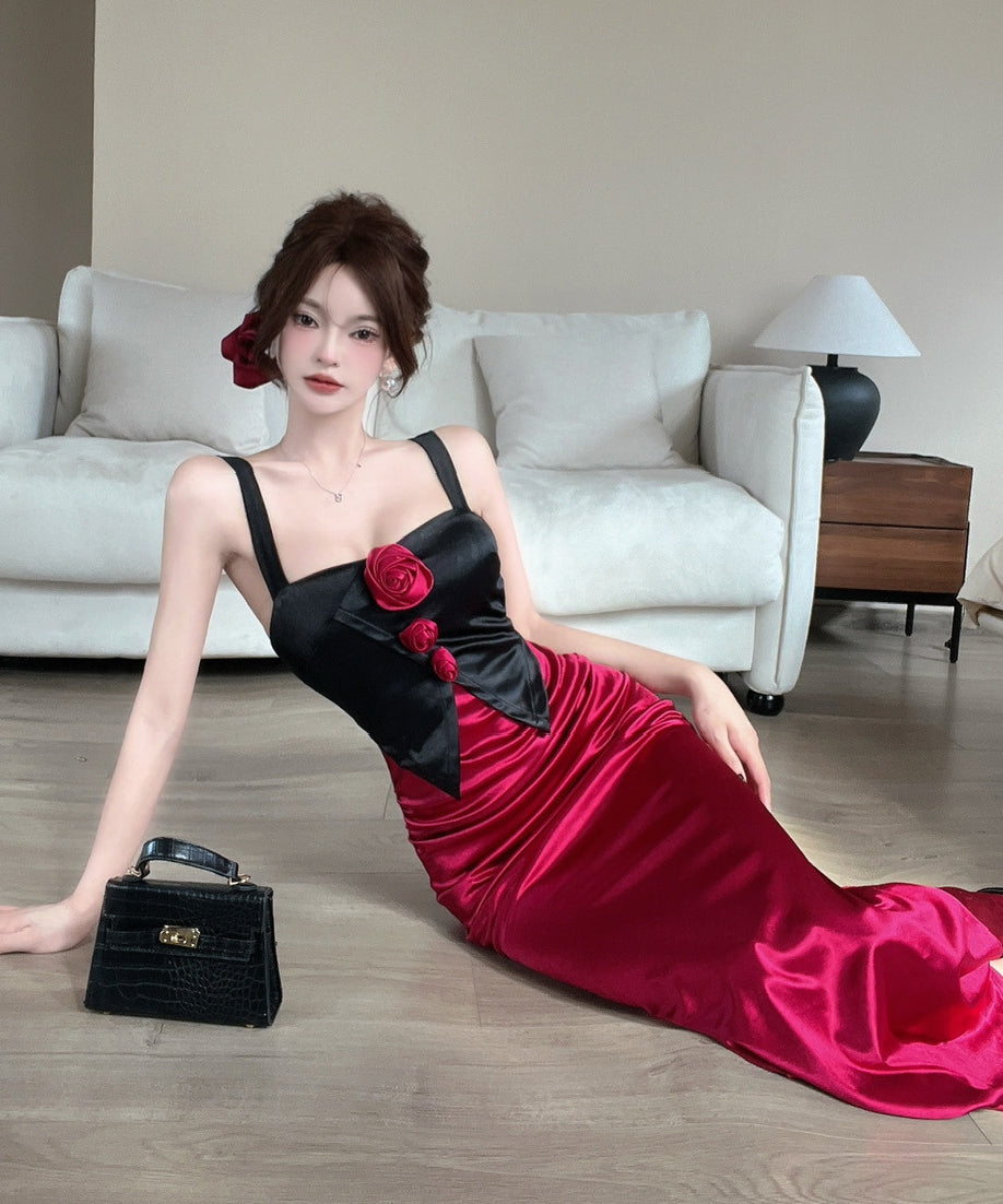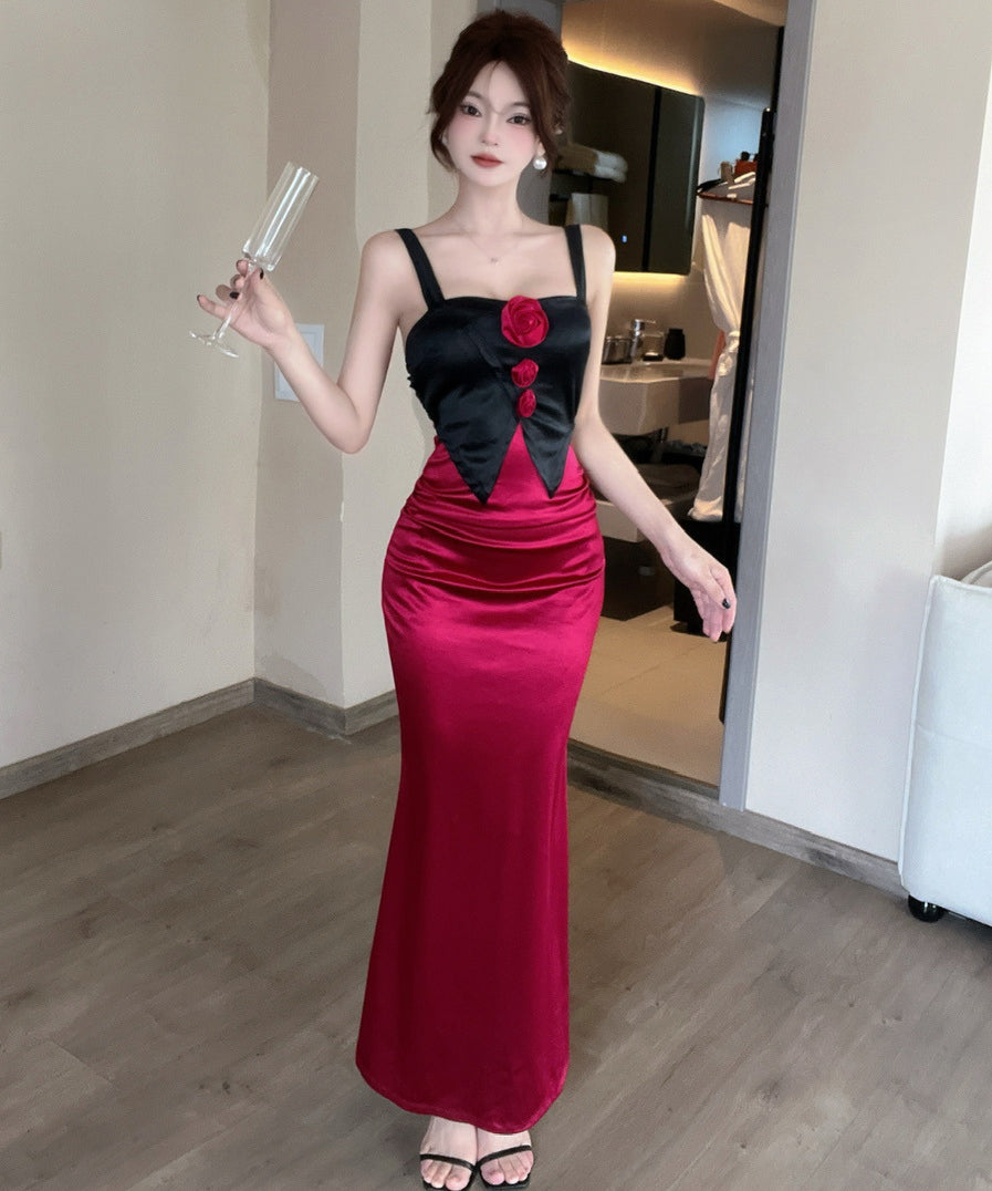 【2色】Lady's coco ロングドレス キャバドレス セクシー 韓国風 サテン 配色 フラワー装飾 スリット入り ボディコン JC2-MLS81282009