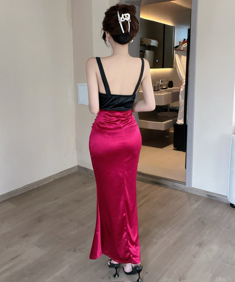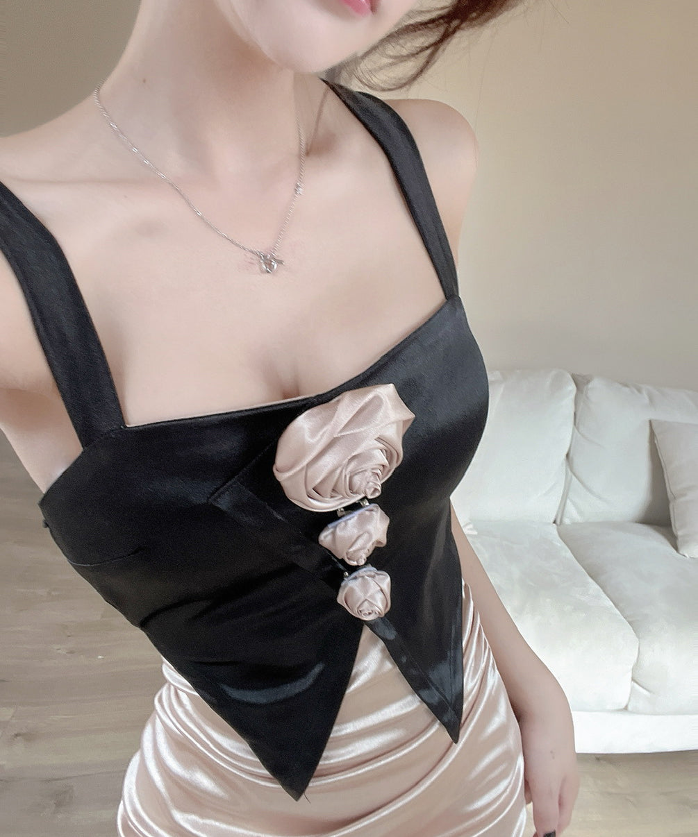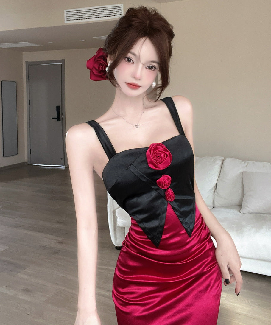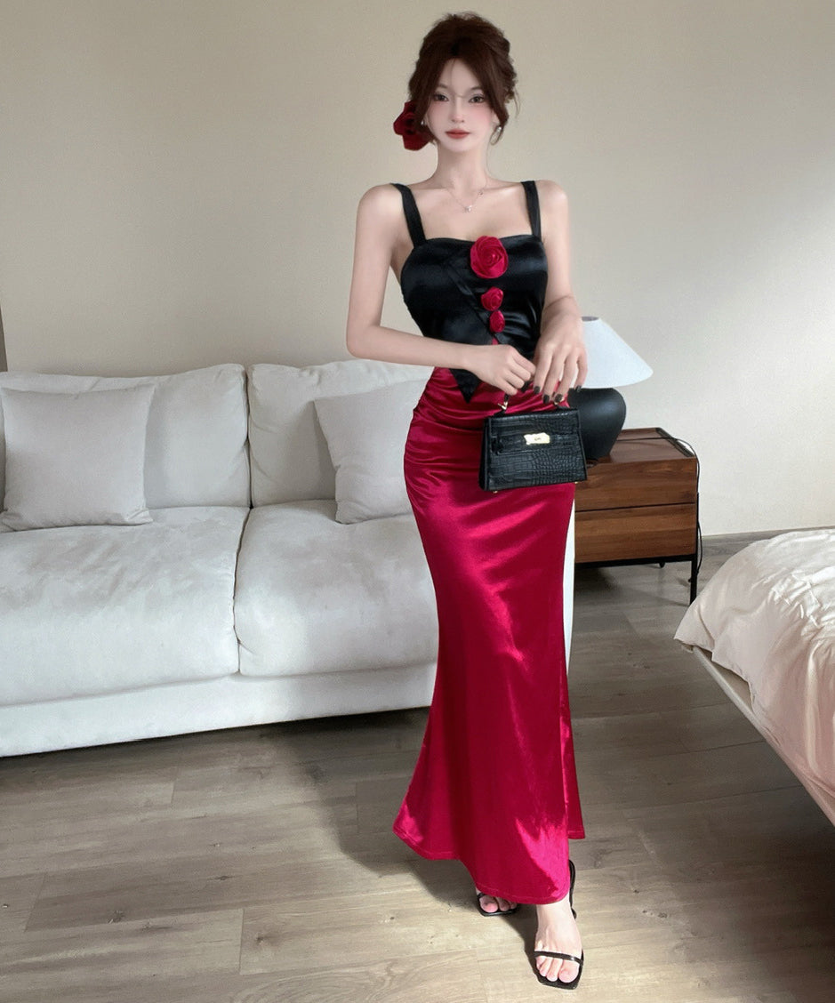 【2色】Lady's coco ロングドレス キャバドレス セクシー 韓国風 サテン 配色 フラワー装飾 スリット入り ボディコン JC2-MLS81282009