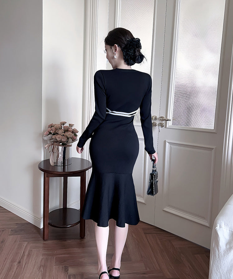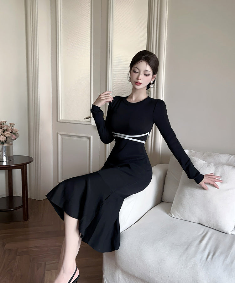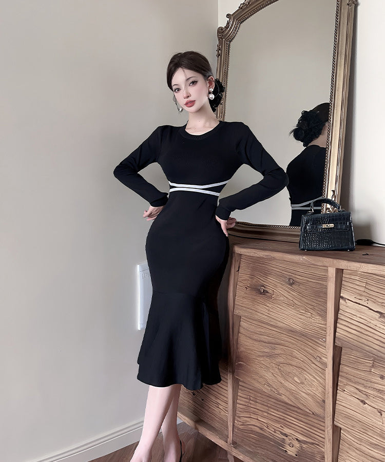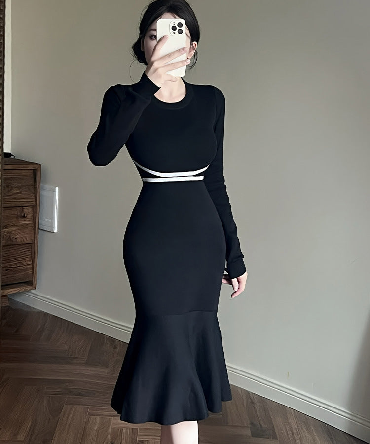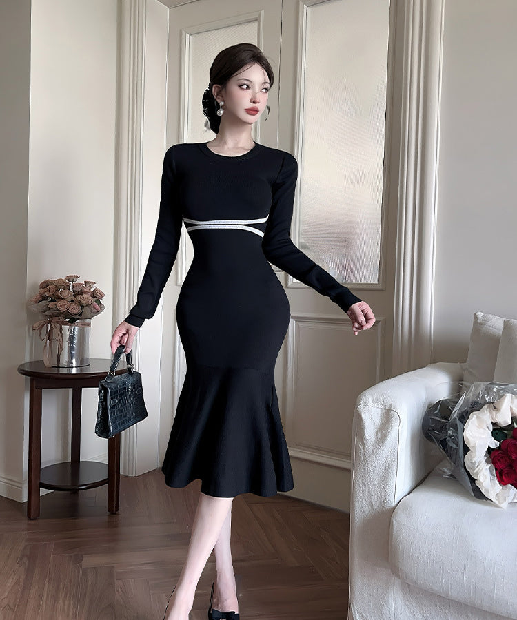 膝丈ドレス キャバドレス セクシー フェミニン ニットワンピース ラウンドネック ウエストマーク マーメイドライン 大人可愛い デート LW2-ZED885053GT510D