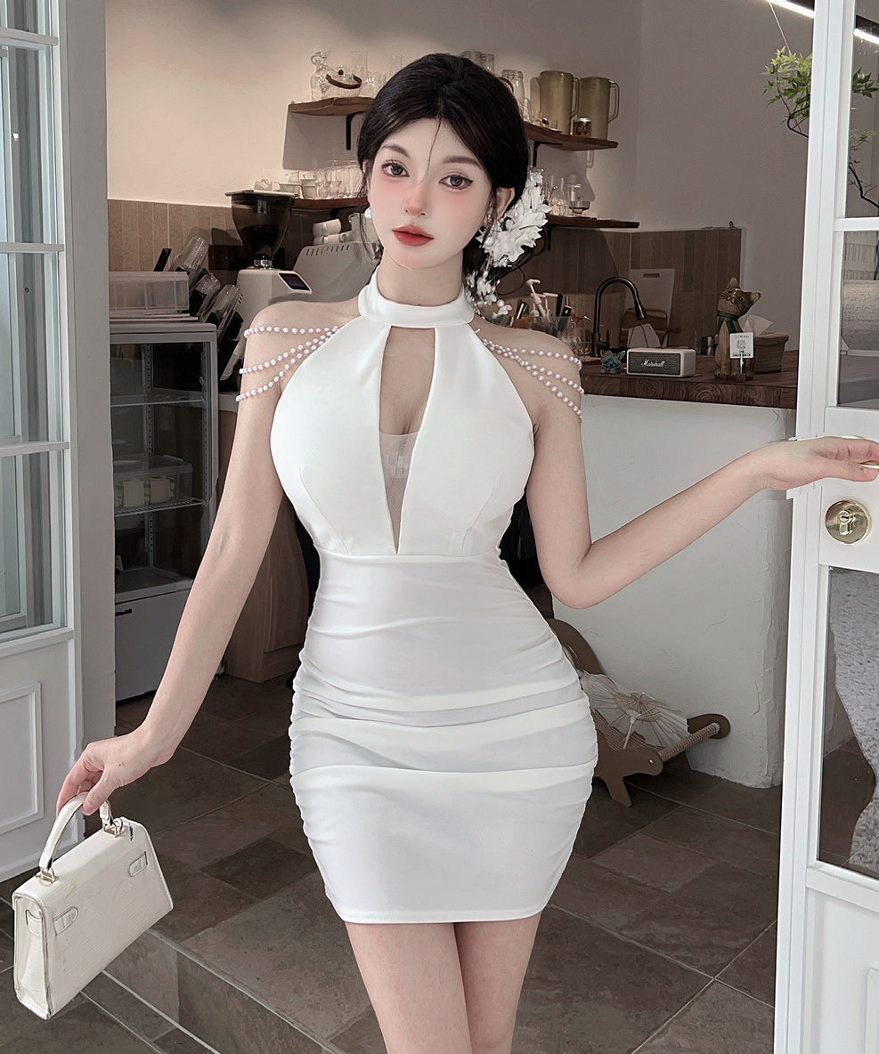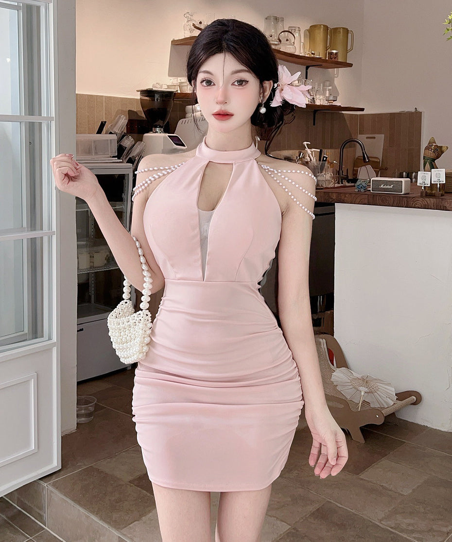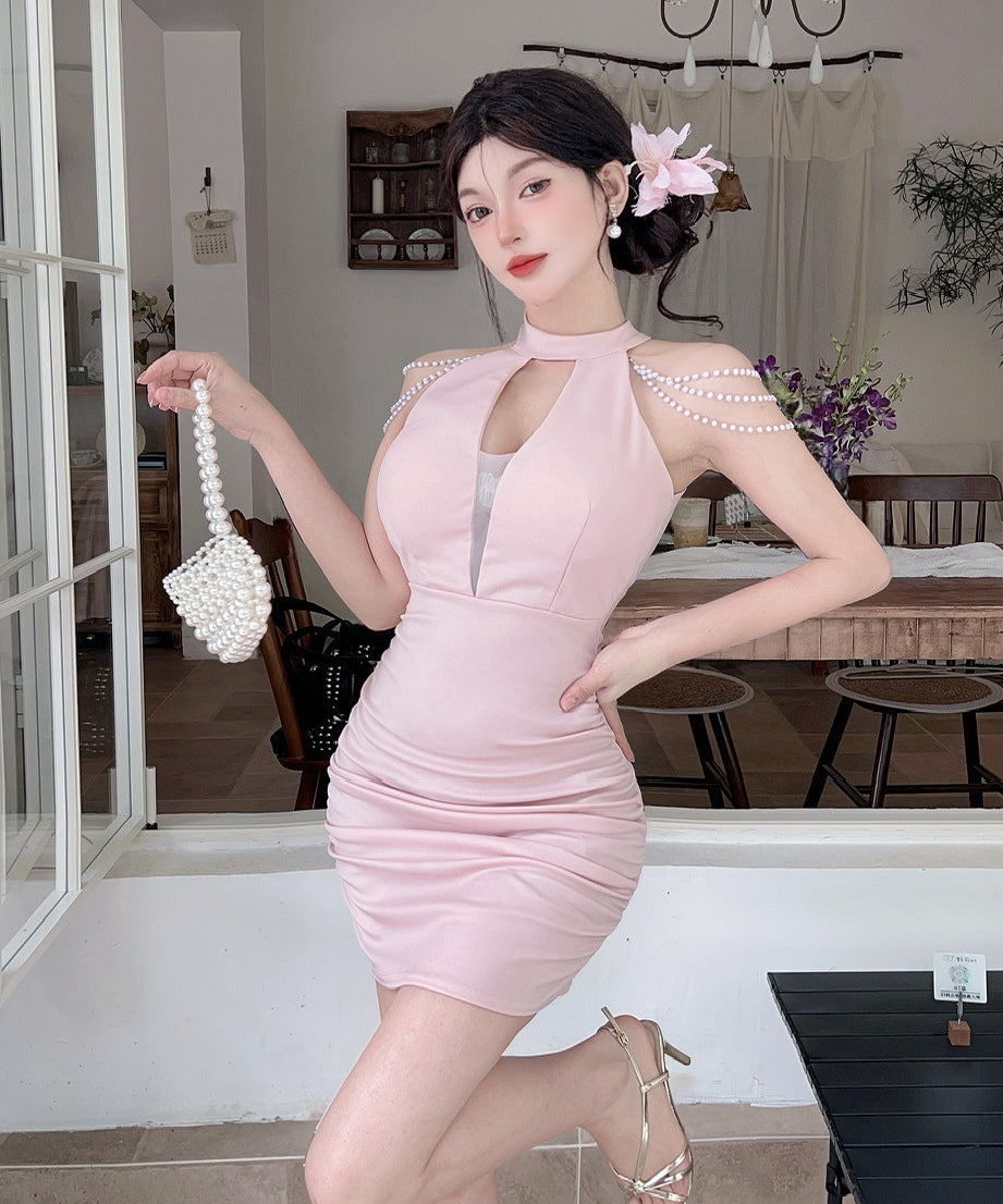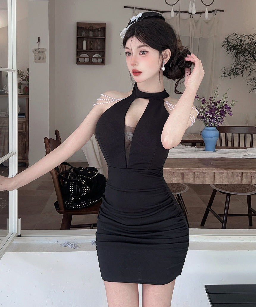 【3色】ミニドレス キャバドレス セクシー 胸元大胆 ホルターネック 肩見せ タイトシルエット 細見え パールチェーン JC2-DD6320
