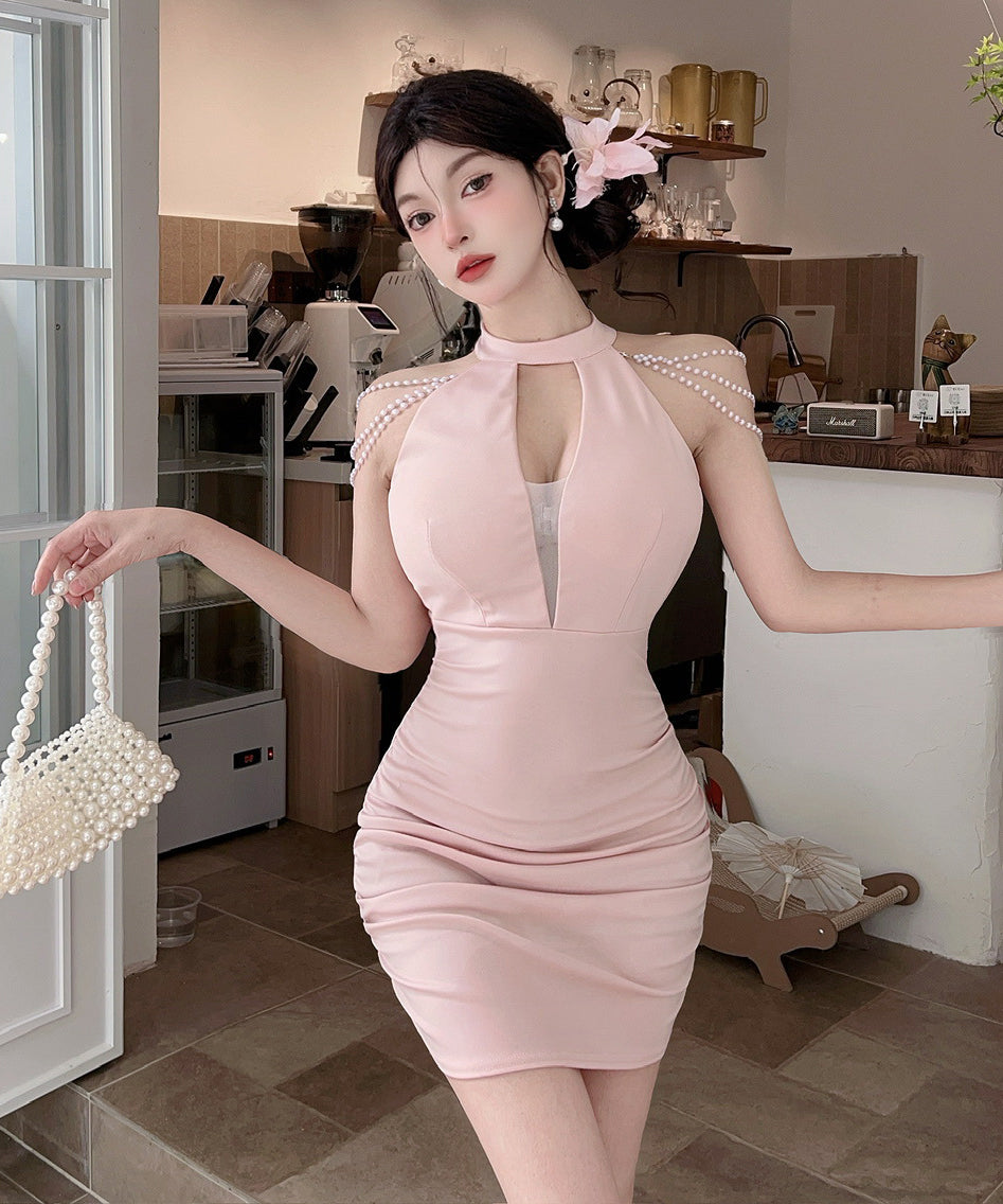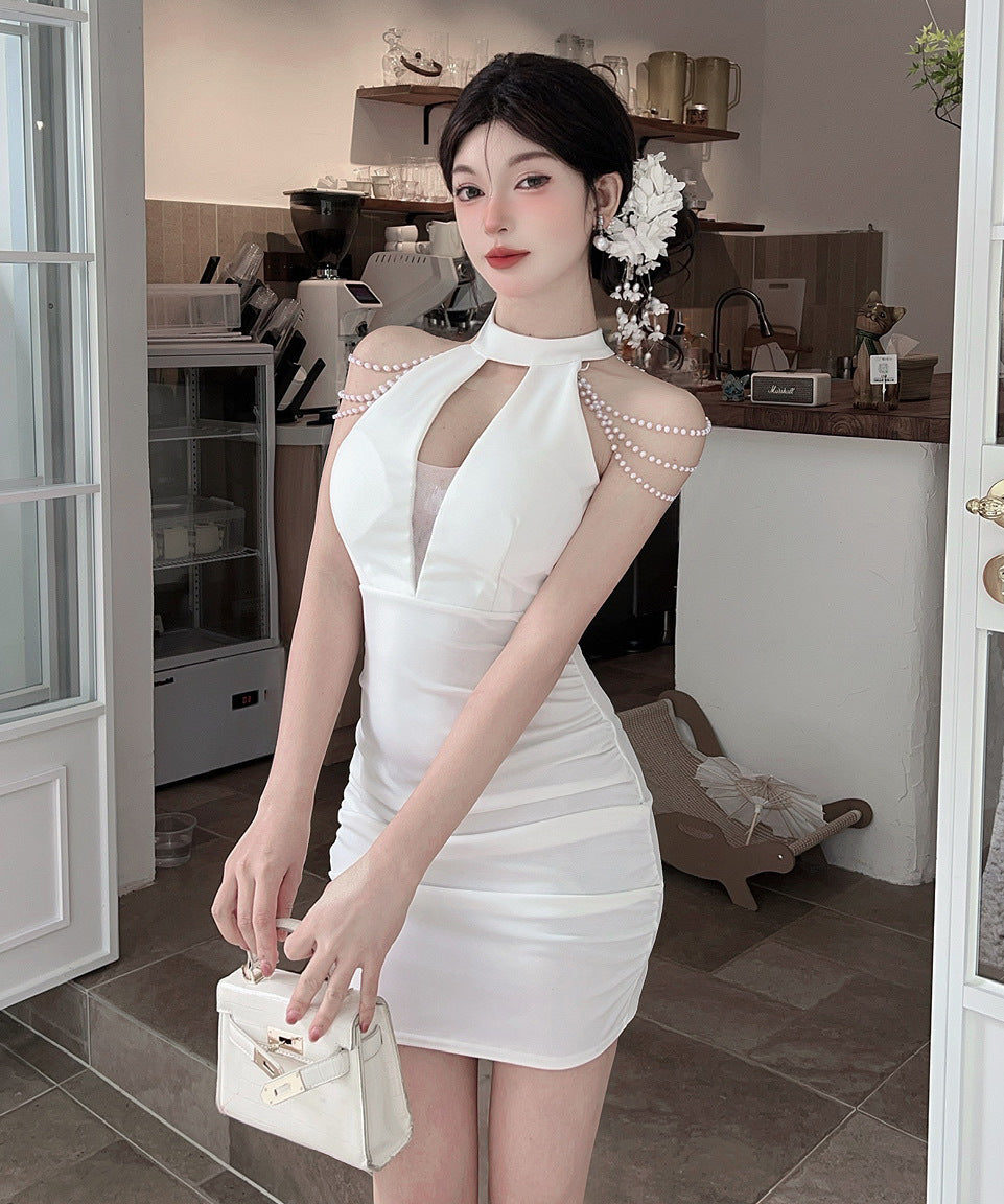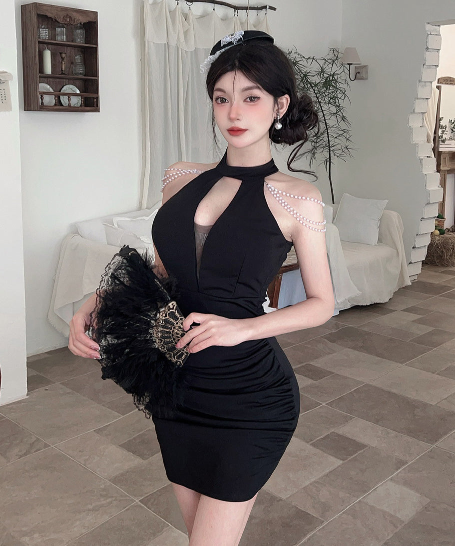【3色】ミニドレス キャバドレス セクシー 胸元大胆 ホルターネック 肩見せ タイトシルエット 細見え パールチェーン JC2-DD6320