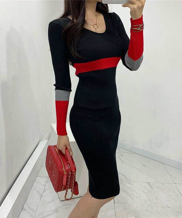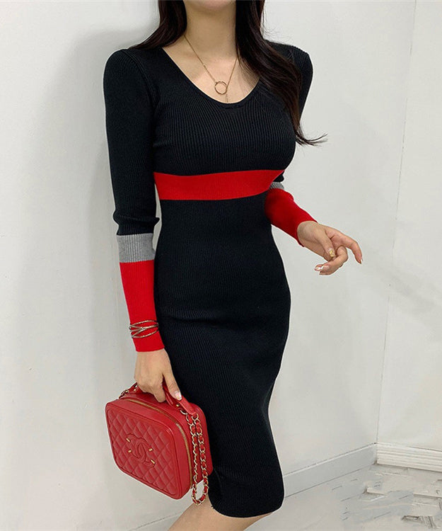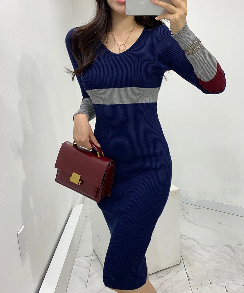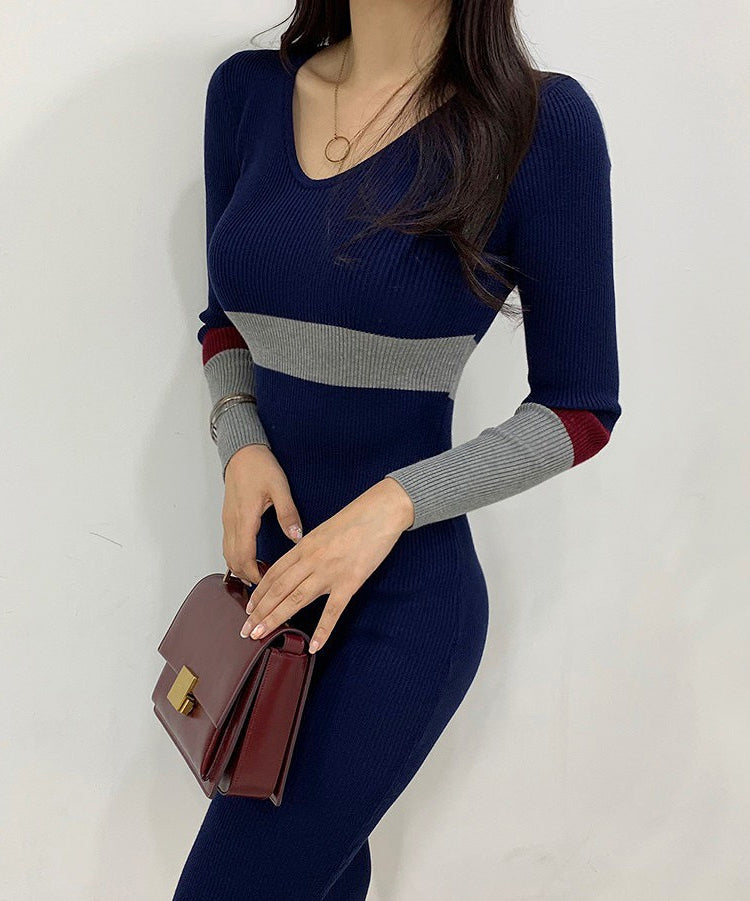 【3色】膝丈ドレス セクシー 韓国風 Vネック タイト ミディワンピ コンビカラー 出勤 デート お出かけ JC2-MLS57526258