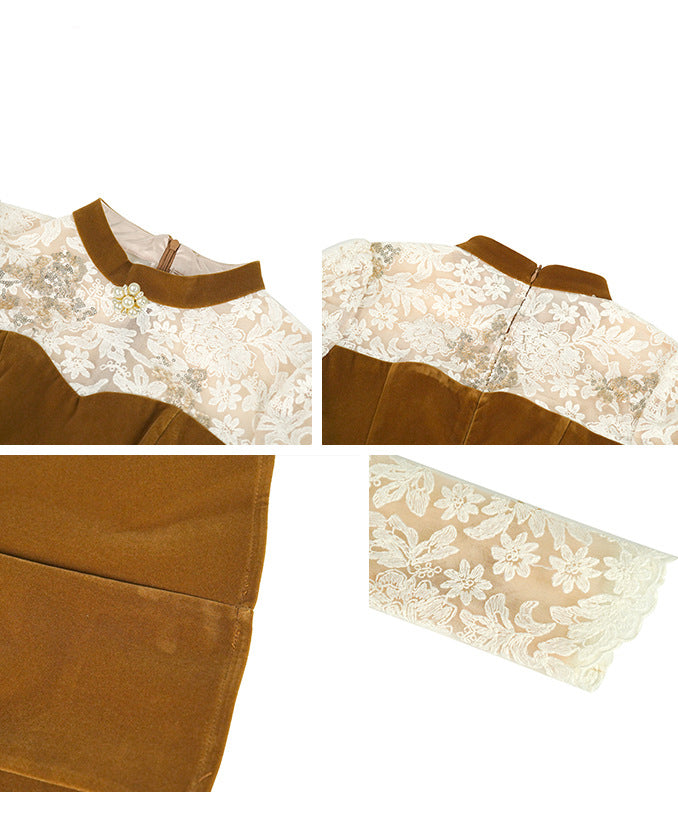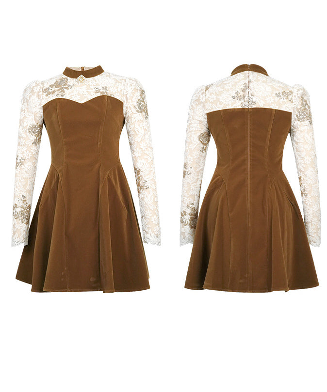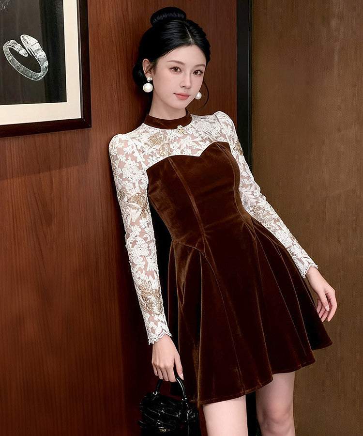 Lady's coco ミニドレス キャバドレス セクシー 上品ベロアワンピース レース切替 バイカラー 長袖 ウエストマーク Aラインシルエット LW2-JY21922