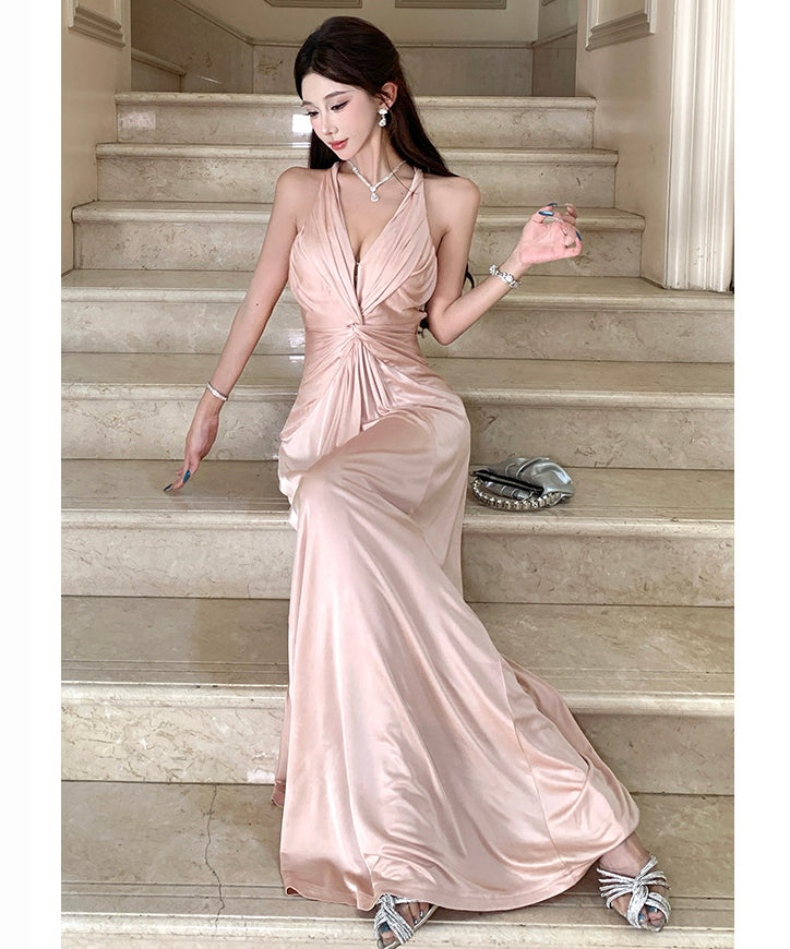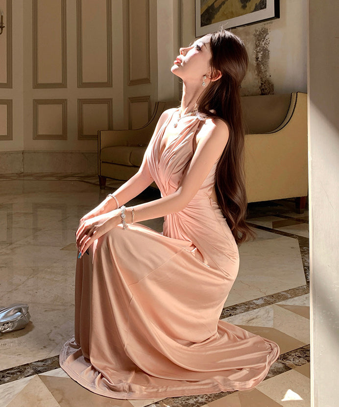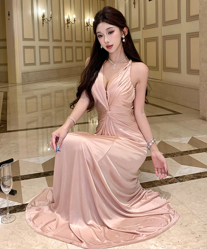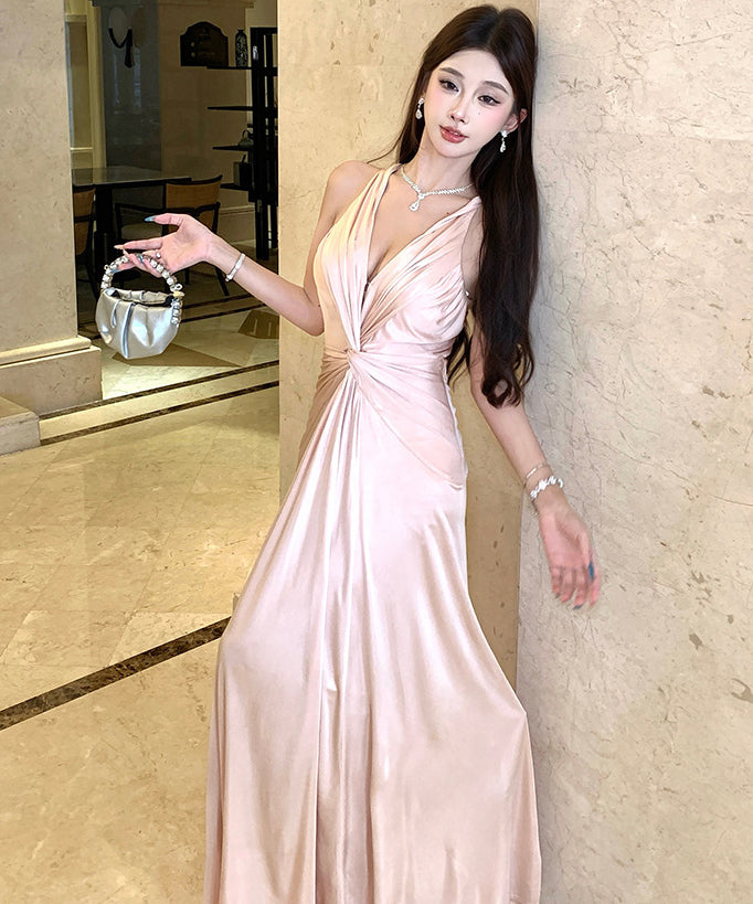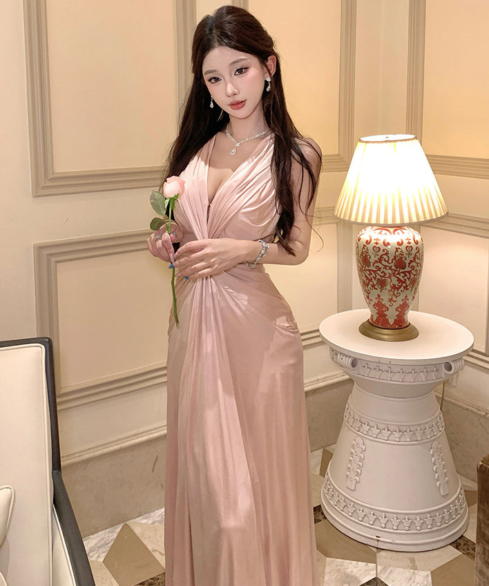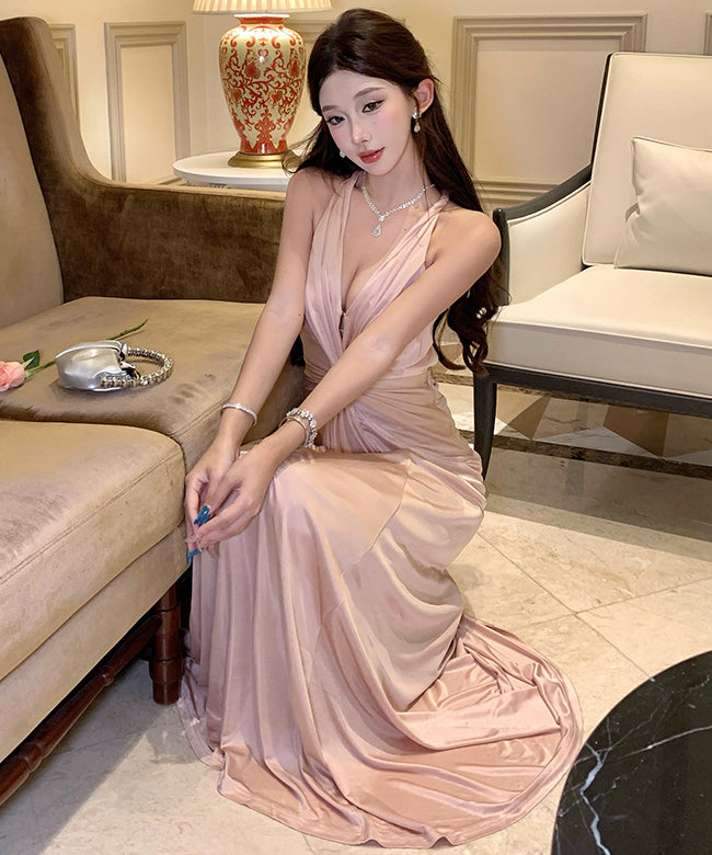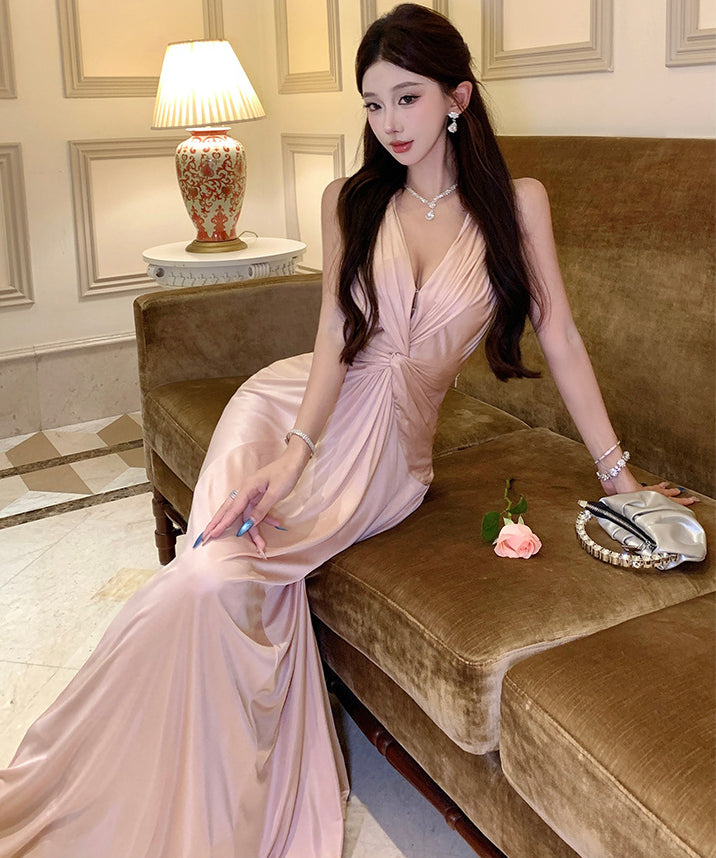 Lady's coco ロングドレス キャバドレス セクシー シャンパンピンク 調節可能 ディープV バックレス ツイストデザイン ギャザー入り 誕生日 パーティー JC2-XHY919295
