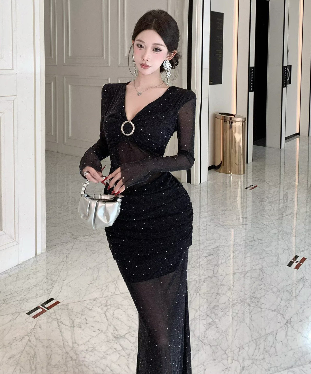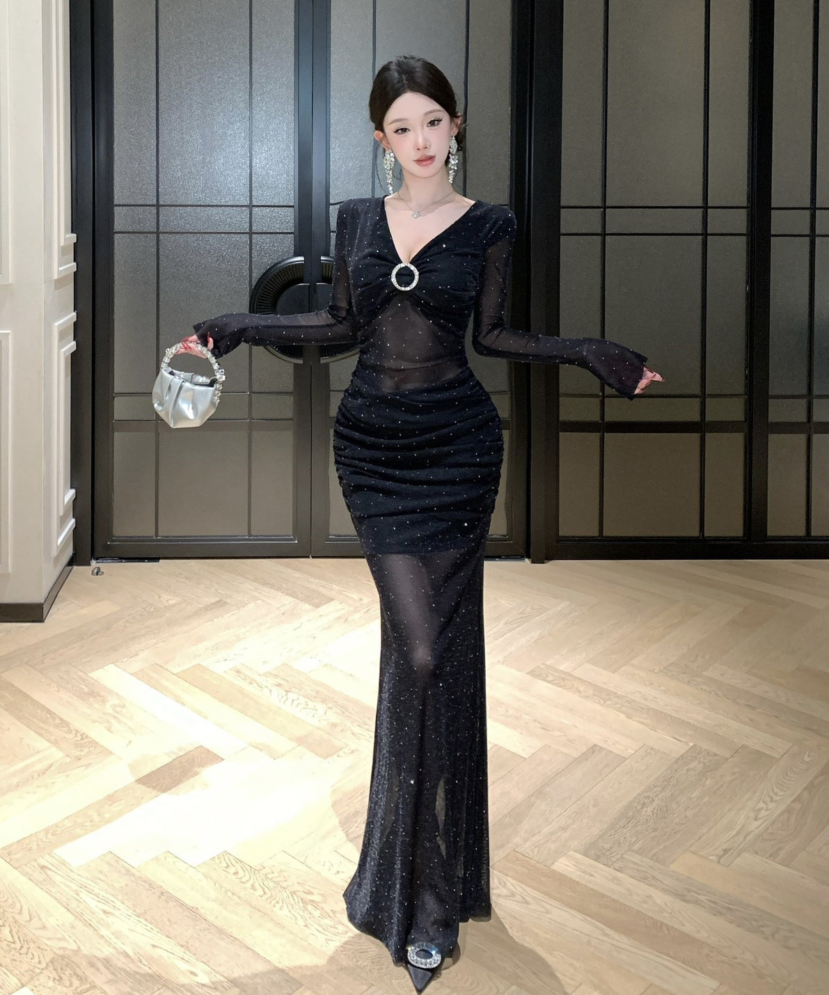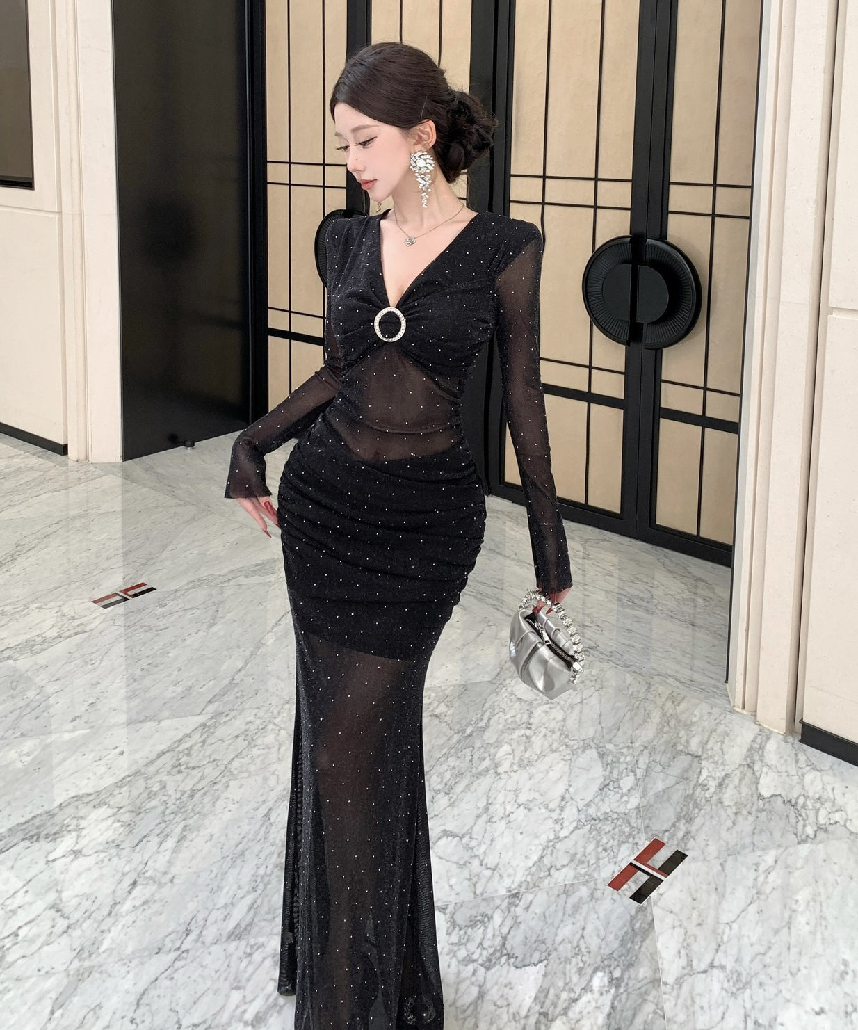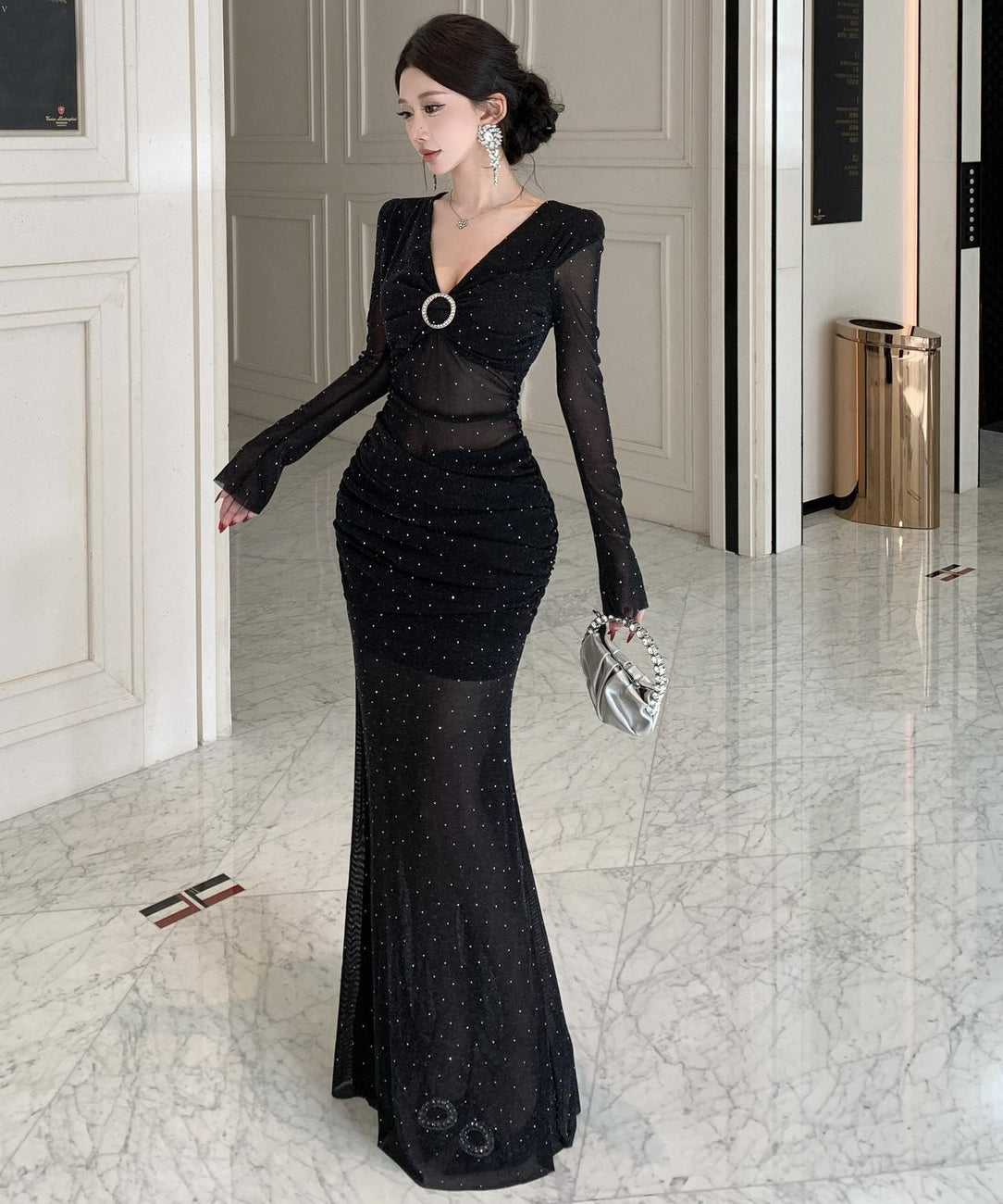Lady's coco ロングドレス キャバドレス セクシー ストーン 深Vネック シースルー タイト マーメイドワンピース LW2-OYF8722