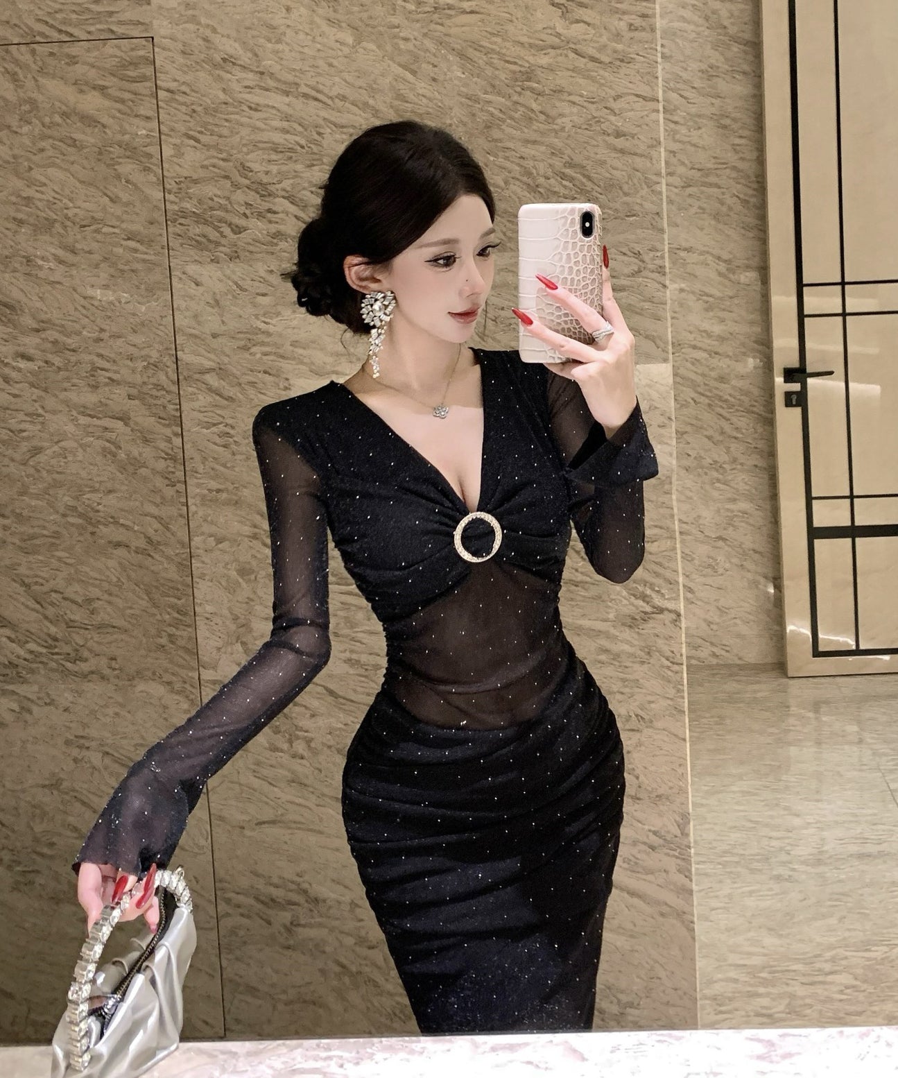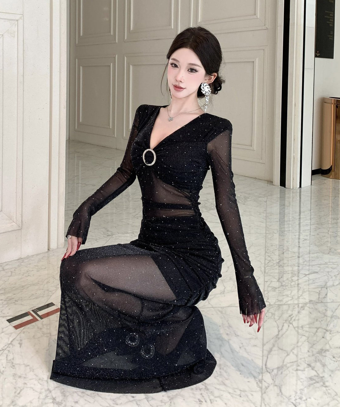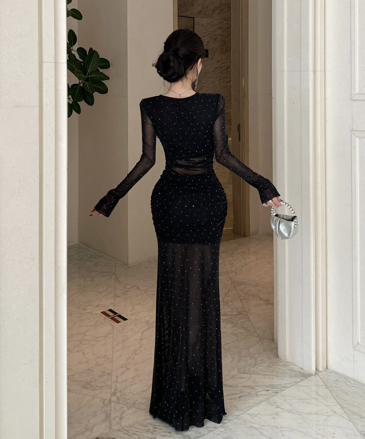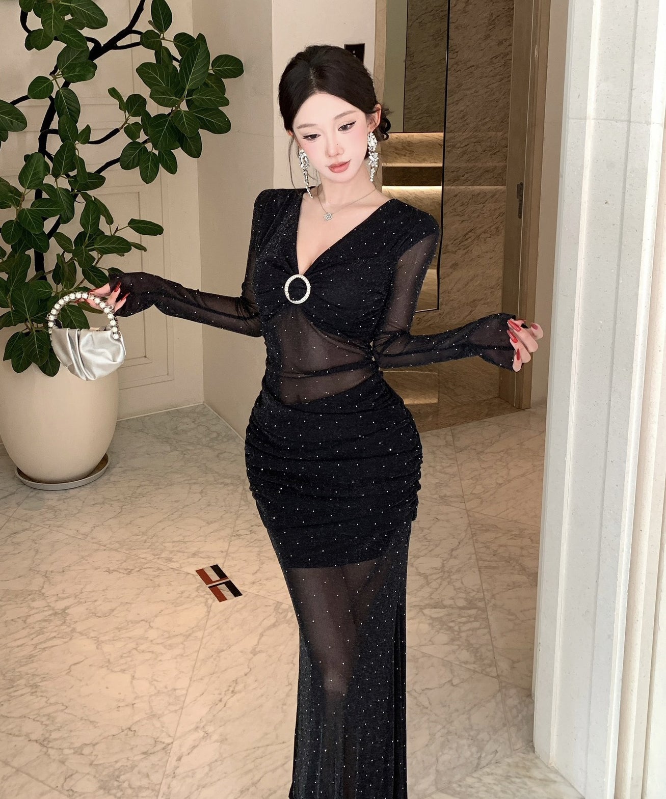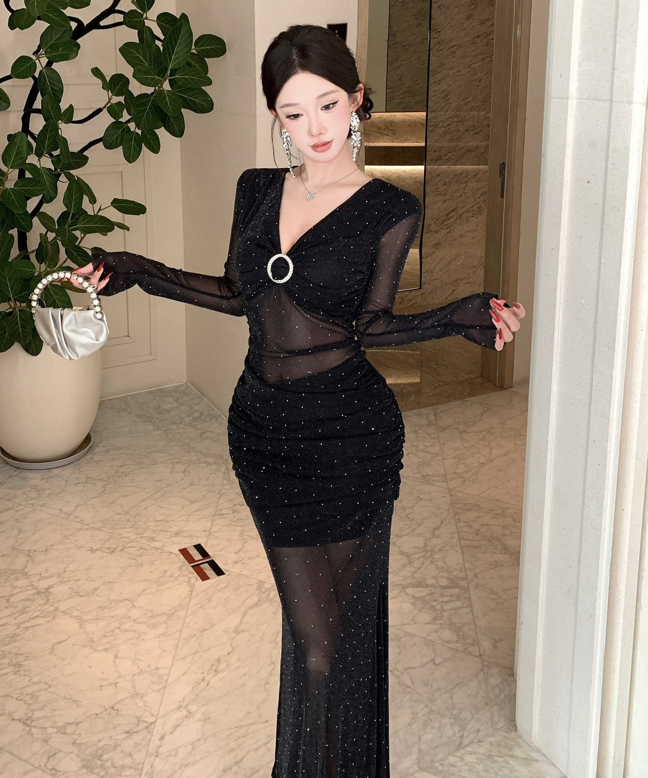 Lady's coco ロングドレス キャバドレス セクシー ストーン 深Vネック シースルー タイト マーメイドワンピース LW2-OYF8722
