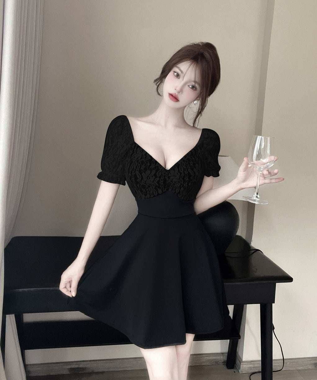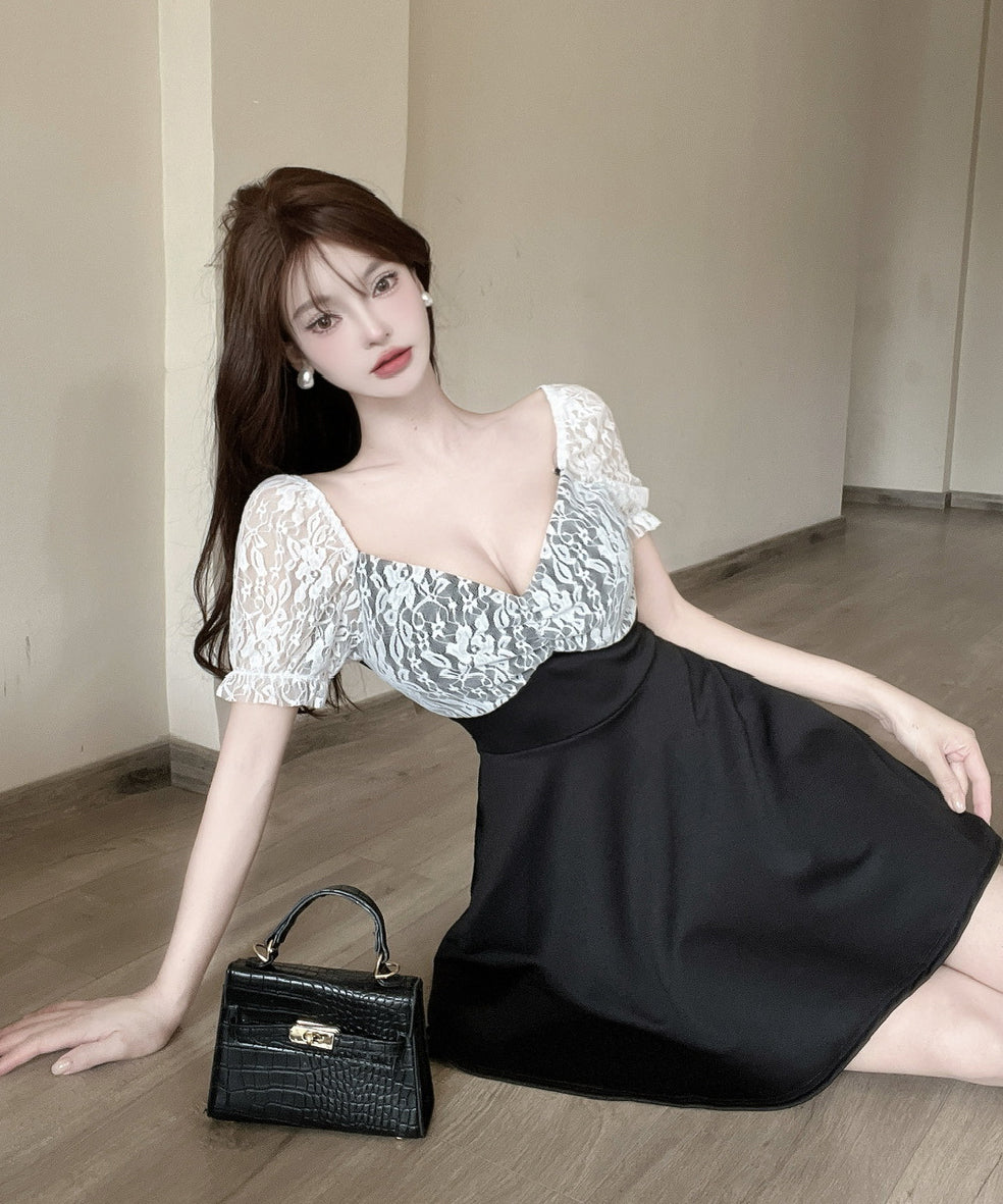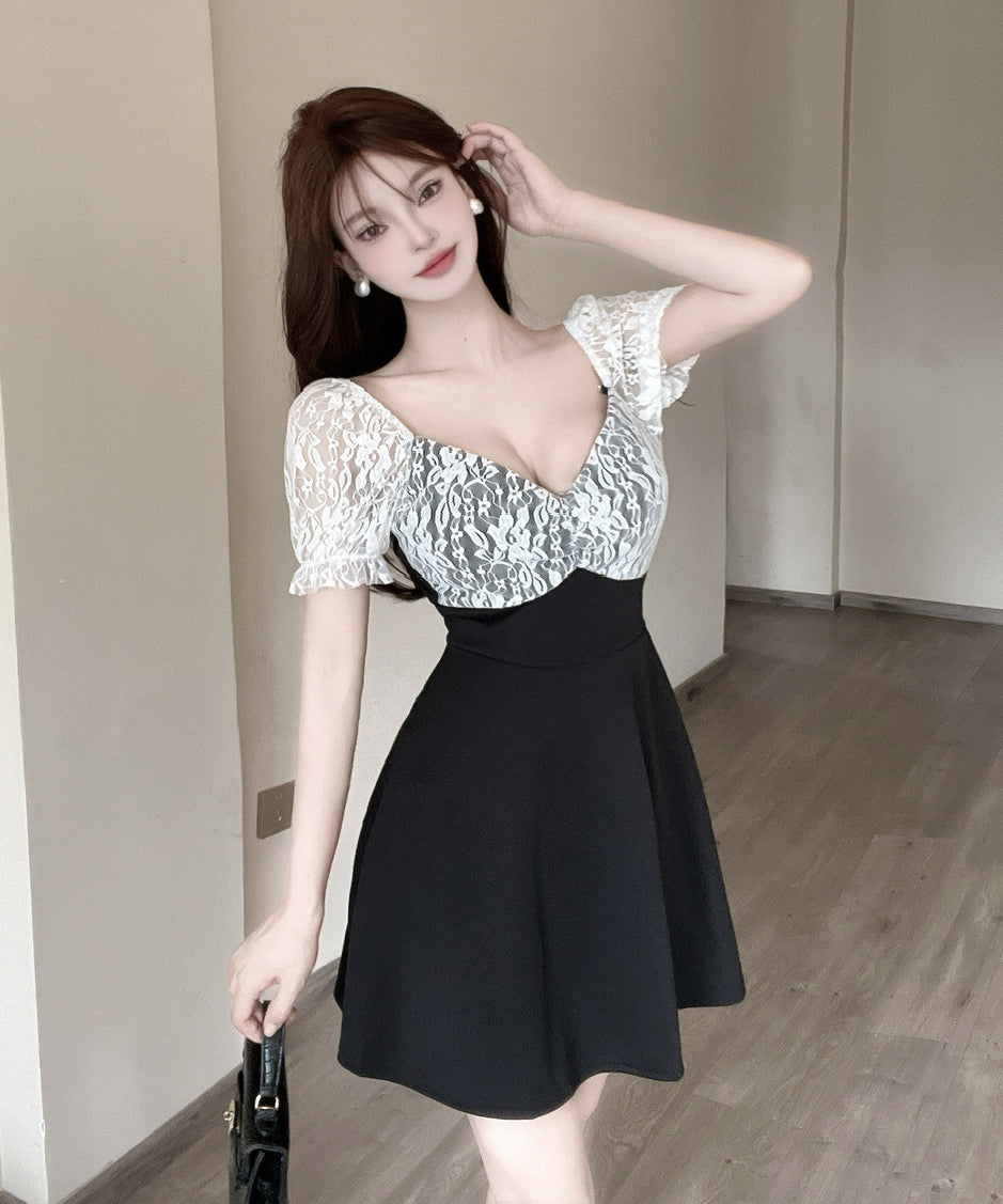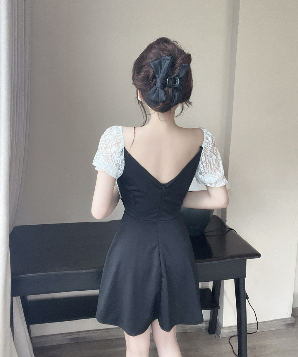 【3色】ミニドレス パフスリーブ レース カワセクシー 肌見せ Aライン 着痩せ XH2-DD7219