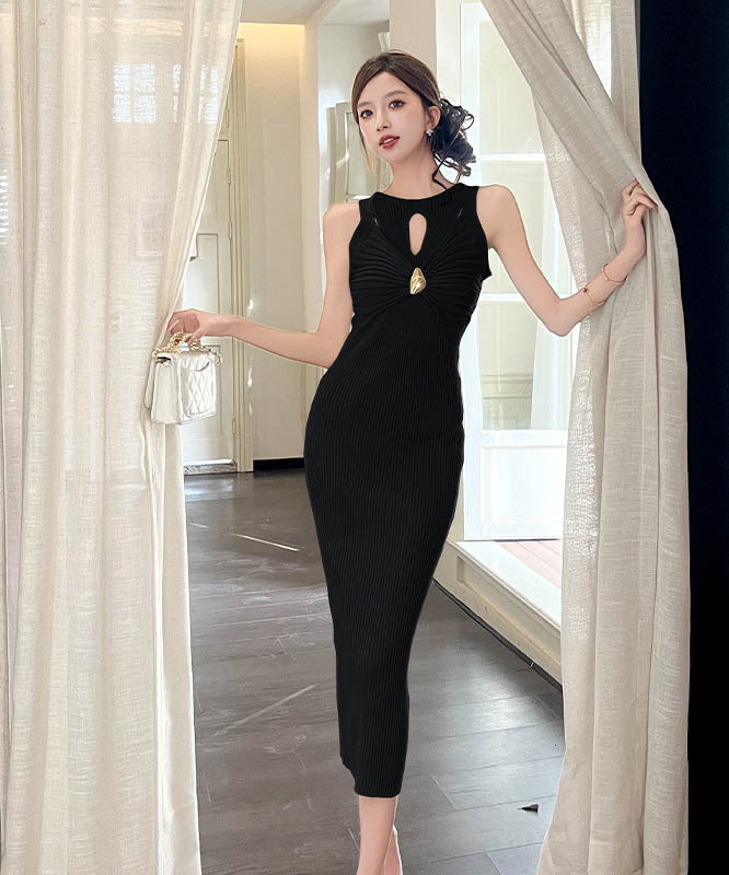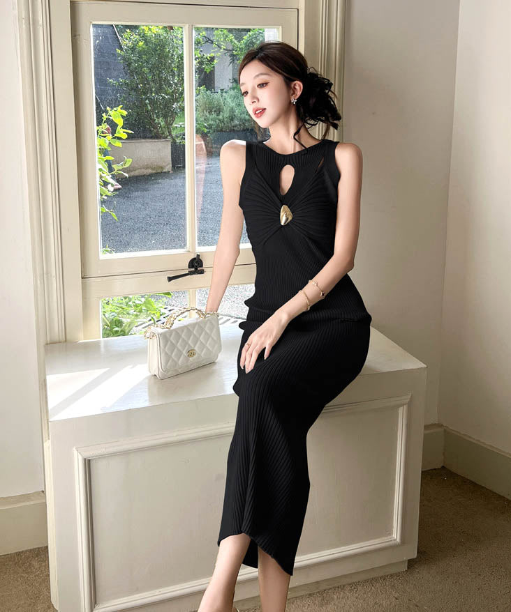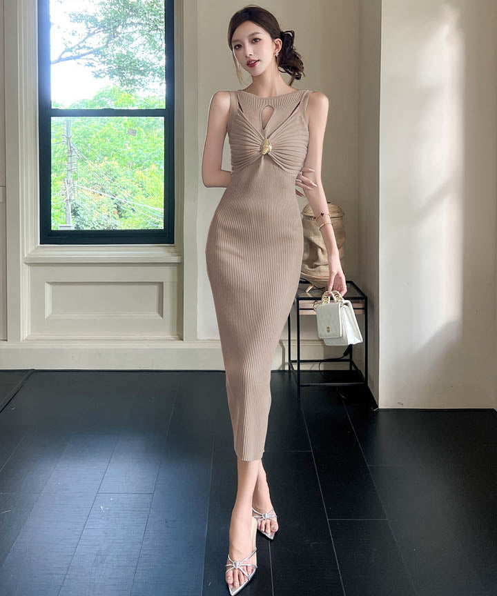 4色ロングドレスニットドレスセクシーノースリーブ谷間見せエレガント通勤 WQ2-ZED889095GT513